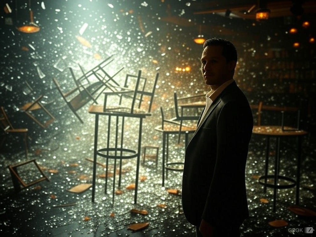 I could feel the gravity returning to near-Earth levels as I slid off the table and saw a hundred or so wobbly bar patrons crowding towards an exit, floating the injured up from the floor and carrying them along. I followed the noisy river of people towards the emergency exit, grabbing tables along the way as my feet navigated the slimy, smelly cocktail of booze, barf, and blood.
