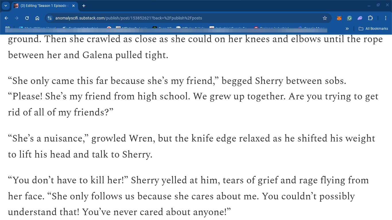 It’s been a long journey since last fall when Amazon announced that Kindle Vella was going away. I’d already written some of Season 3 and suddenly needed to take time off from writing the continuing saga to find a new home for Anomaly. Last month, I finished copying and drafting everything to Substack. Yesterday morning, I finished polishing and pre-scheduling the last episode of the Substack edition of Season 1. If Amazon hadn’t canceled Kindle Vella, hundreds of readers there would have experienced Season 3 Episode 6 last week.