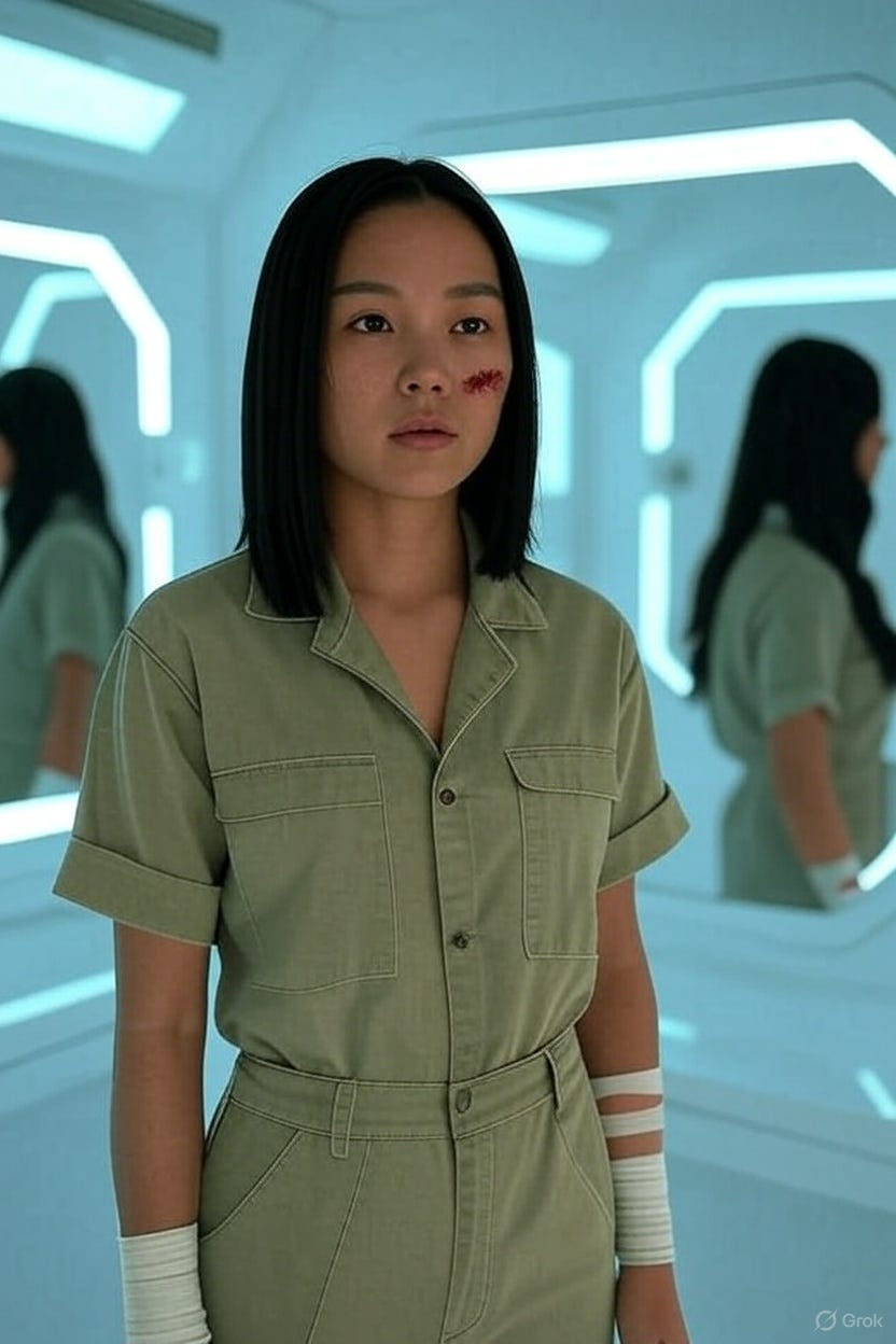 “Hold on,” she said, getting up out of the chair and limping across to the bathroom mirror to examine her scraped cheek, but immediately regretted it. A wave of sadness came over her as she reached up and touched her hair, still nowhere near enough of it to hold a proper braid. She hated her new look and had avoided mirrors ever since arriving here. Why does hair take so much time to grow back?